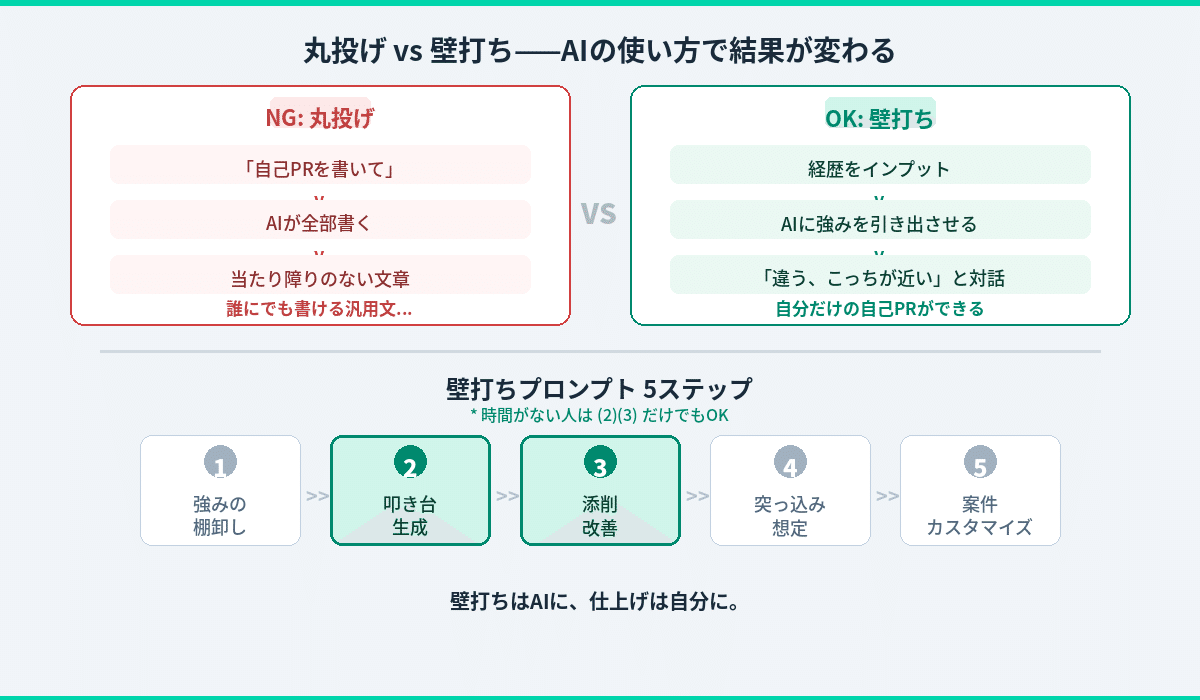 - 丸投げ:「自己PRを書いて」→ AIが全部書く → 当たり障りのない文章が出てくる