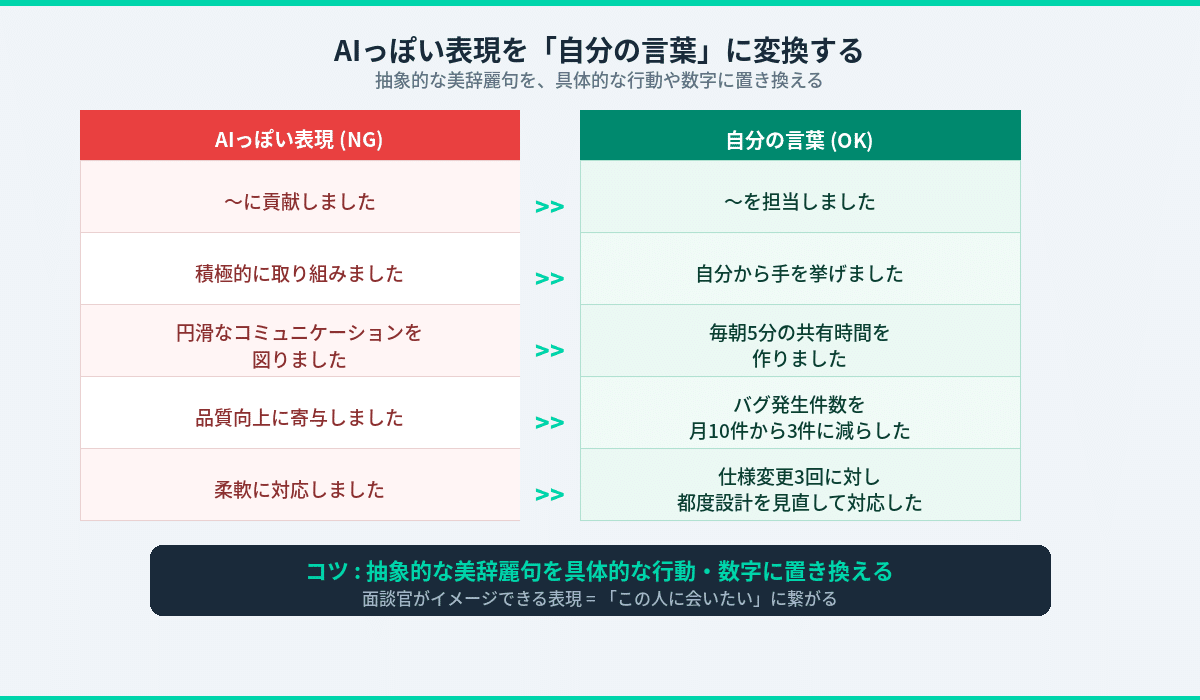 「円滑なコミュニケーション」と言われても面談官はイメージできないが、「毎朝5分の共有時間」なら絵が浮かぶ。