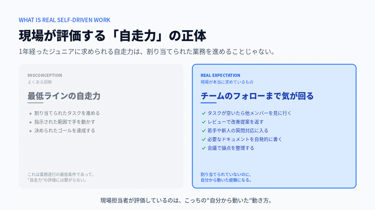 これらは全部、「割り当てられていないのに自分から動いた」経験だ。そしてこれこそが、現場担当者が本当に評価している自走力の正体だ。