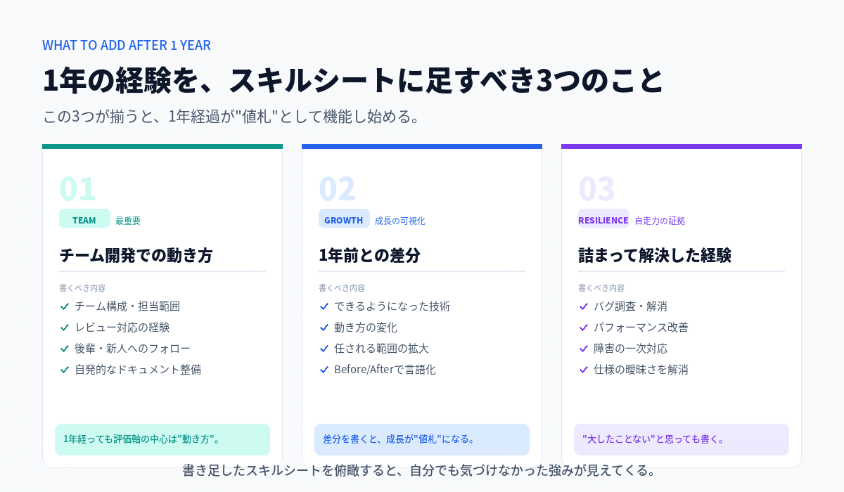 技術力そのものが急に上がったわけじゃない。1年で実際に積んだ経験を、読める形に"書き足した"だけで、劇的に印象が変わる。