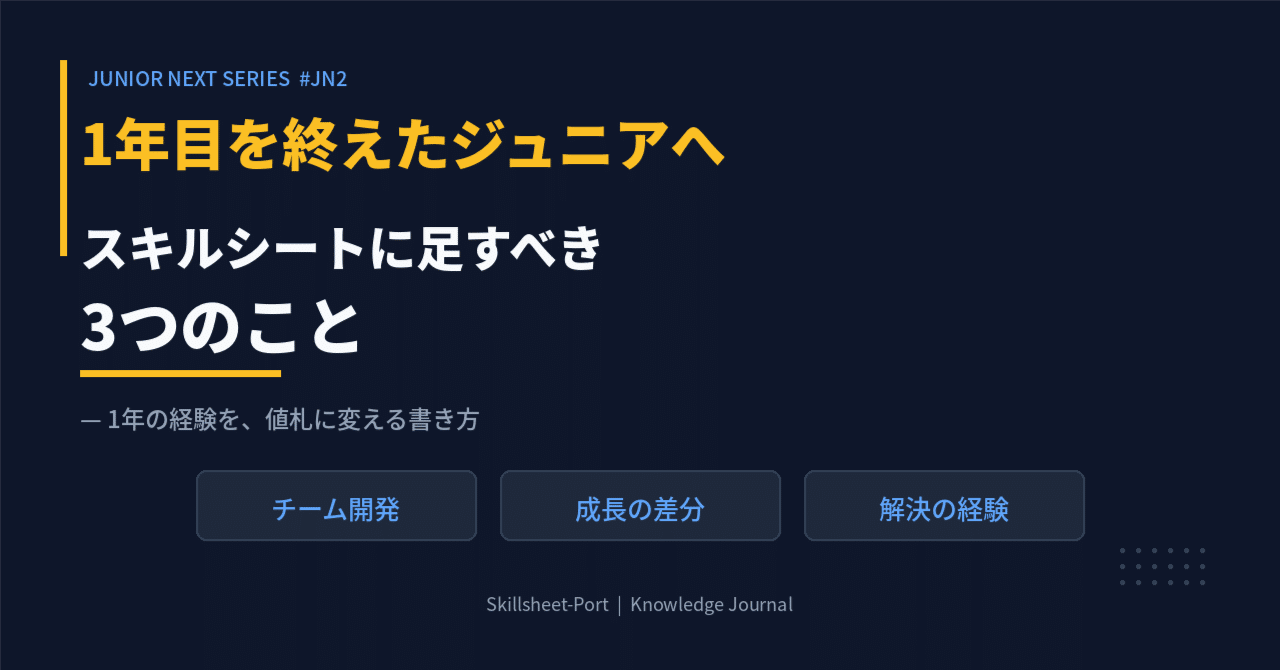 初案件で1年。右も左もわからなかった自分とは、もう違うはずだ。なのに、スキルシートは入場前のまま。これは本当にもったいない。1年間の現場経験は、ちゃんと書けば次の案件・次の単価・次のキャリアの武器になる。その"足し方"を3つ紹介する。