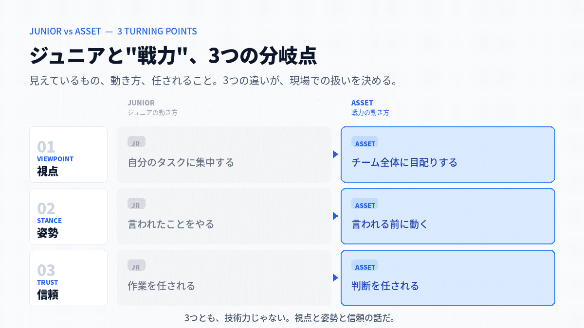 ジュニアから戦力への"分岐点の記録"こそ、次の単価と次のキャリアを決める資料になる。