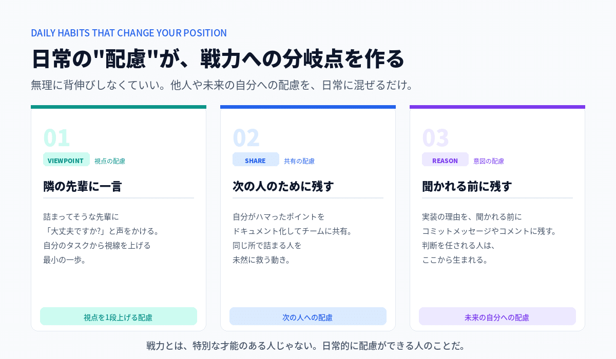 - 分岐点②の提案型の姿勢は → 自分がハマったポイントを、次の人のためにドキュメントに残す"配慮"