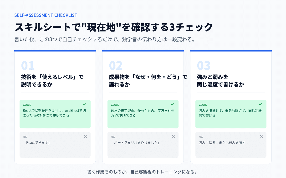 この3つのチェックを通過したスキルシートは、そのまま"自分の現在地を示す地図"になる。