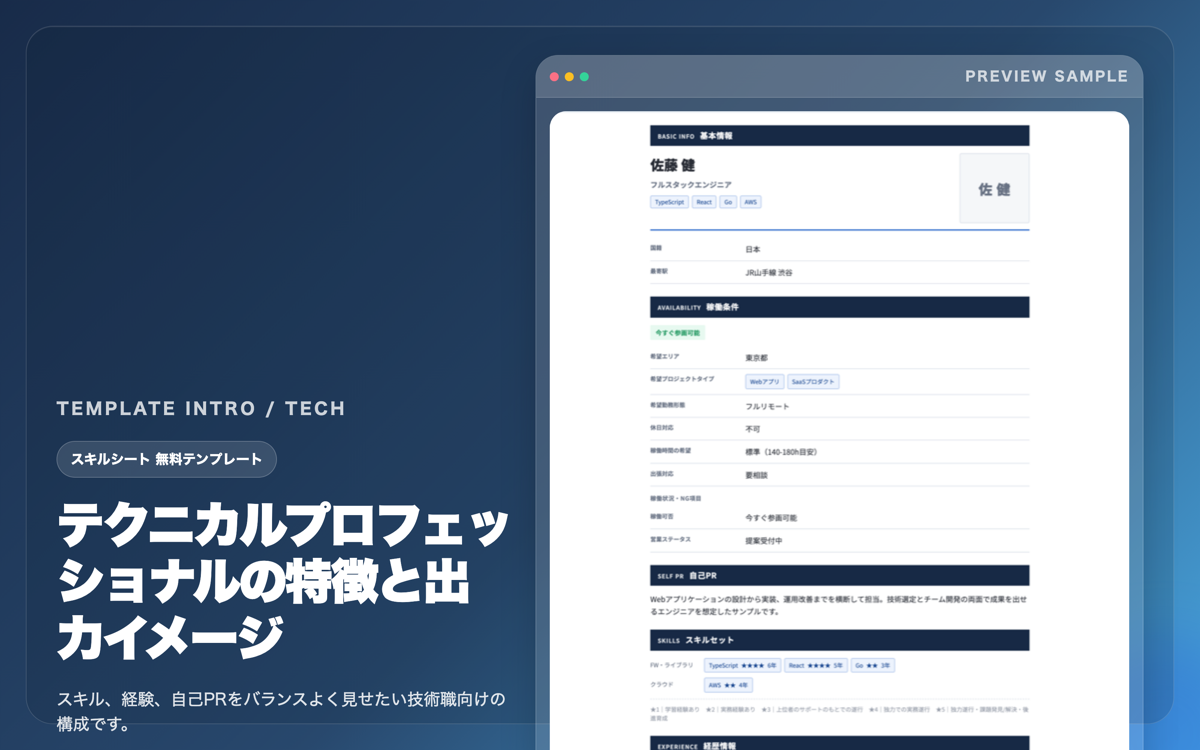 SkillSheet-Port の テクニカルプロフェッショナル は、スキル、経歴、希望条件をバランスよく整理して見せやすい無料テンプレートだ。この記事では、実際の出力イメージを見ながら、どんな人に向いているかを紹介する。