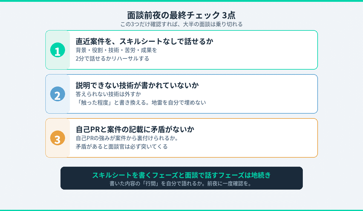 案件の背景、自分の役割、使った技術、苦労した点、成果——これらをスキルシートなしで2分くらい話せるか、声に出してリハーサルしてみてほしい。